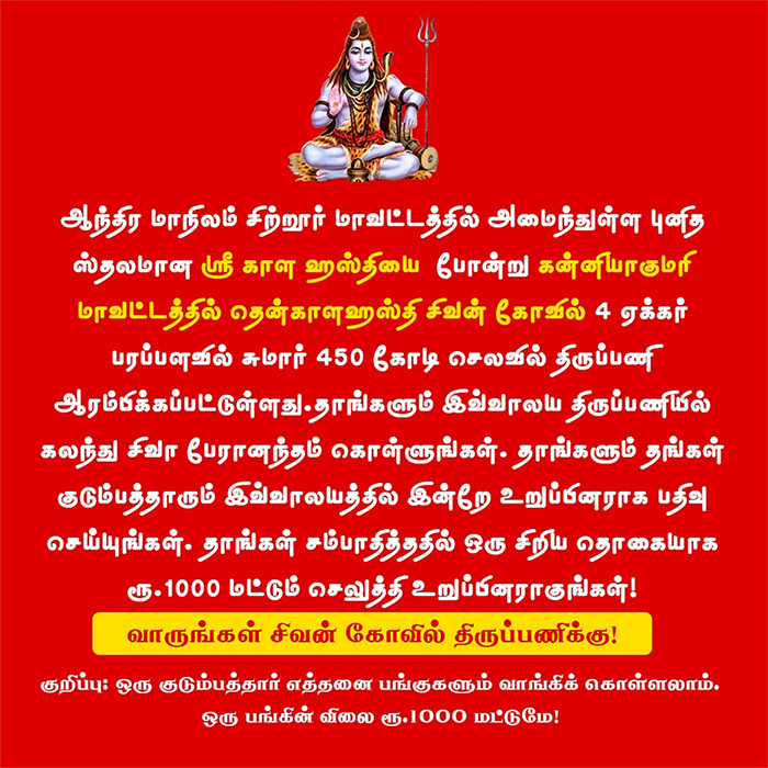 2. ஆலயத்தில் நடக்கும் விசேஷங்களான மஹாசிவராத்திரி ராகு கேது பெயர்ச்சி , சனி பெயர்ச்சி , குரு பெயர்ச்சி முன் அறிவிப்பும் , மற்றும் விழா கமிட்டி கூட்டம் , முக்கிய முடிவுகள் எடுக்கும் போது மேற்படி உறுப்பினர்கள் கலந்து கொள்ளப்படுவீர்கள்.
